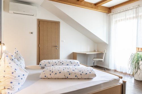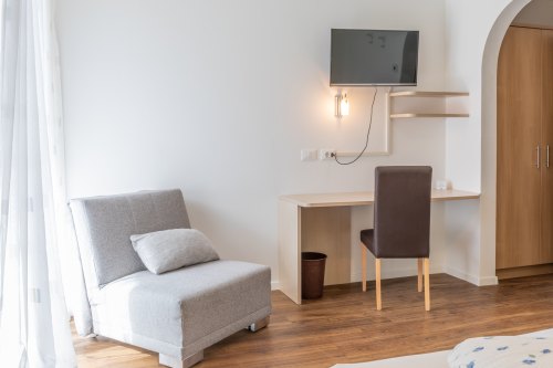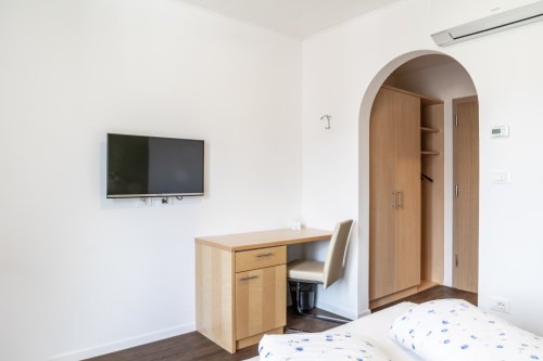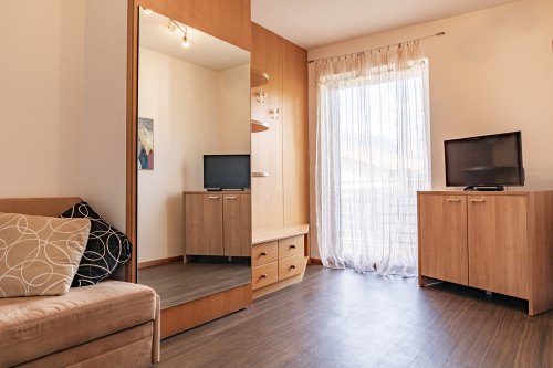 Unsere Ferienwohnung verfügt einen offenen Wohnraum mit ausziehbarer Schlafcouch, Klima, Safe, ein Badezimmer mit Dusche, Haarfön, WC und Bidet. |